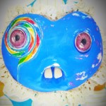 Obiect unicat cu fata realizata din sculpey si vopsita cu vopseluri acrilice, ochii realizati manual din rasina si silicon iar corpul din material textil.